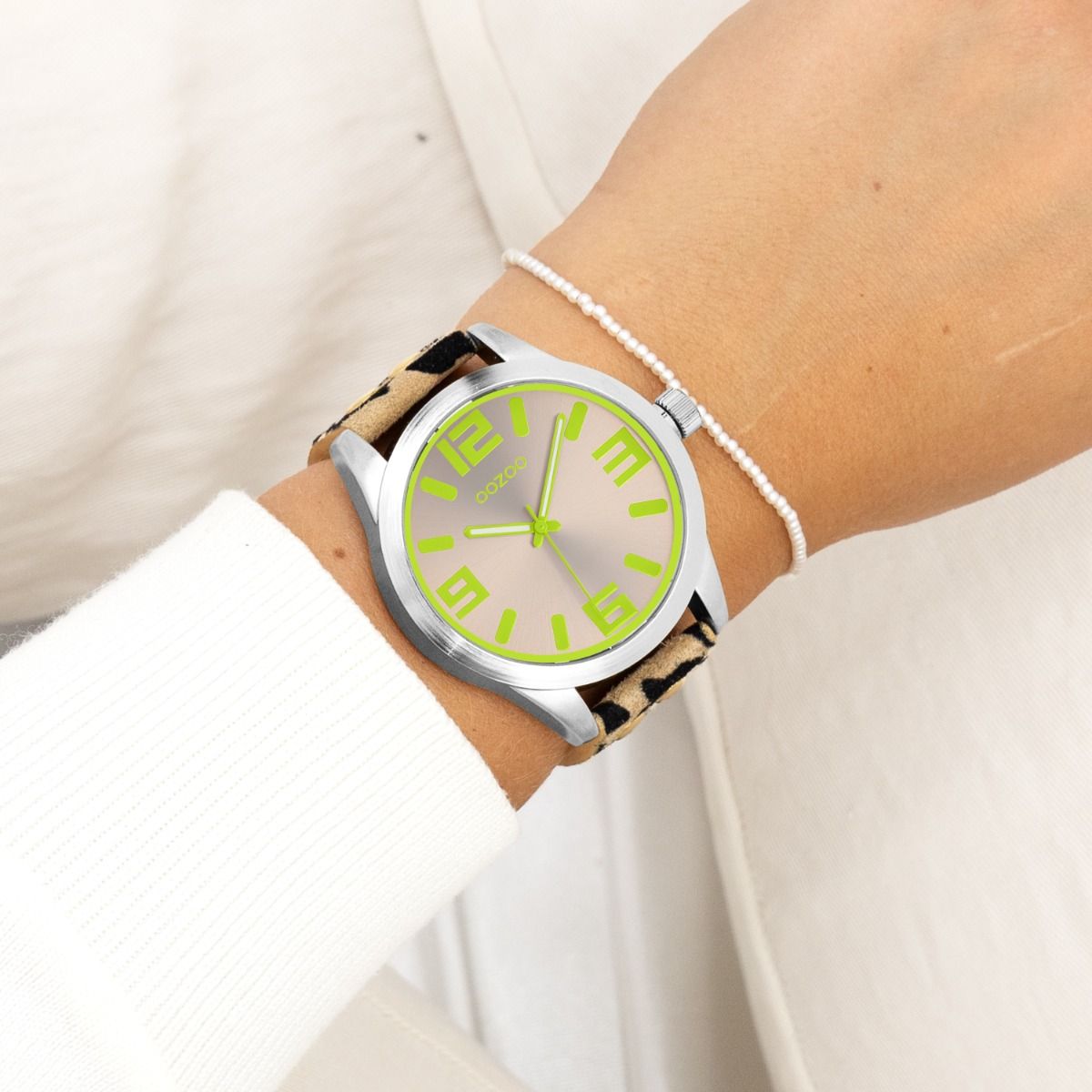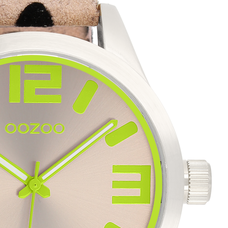 Καινούριο, διαφορετικό και μοδάτο! Το εντελώς νέο ρολόι από την OOZOO έχει υπέροχο animal print δερμάτινο λουράκι και καντράν sunray σε χρώμα taupe. Η γνωστή κάσα OOZOO είναι σε ασημί χρώμα με δείκτες & στοιχεία σε πράσινο fluo.