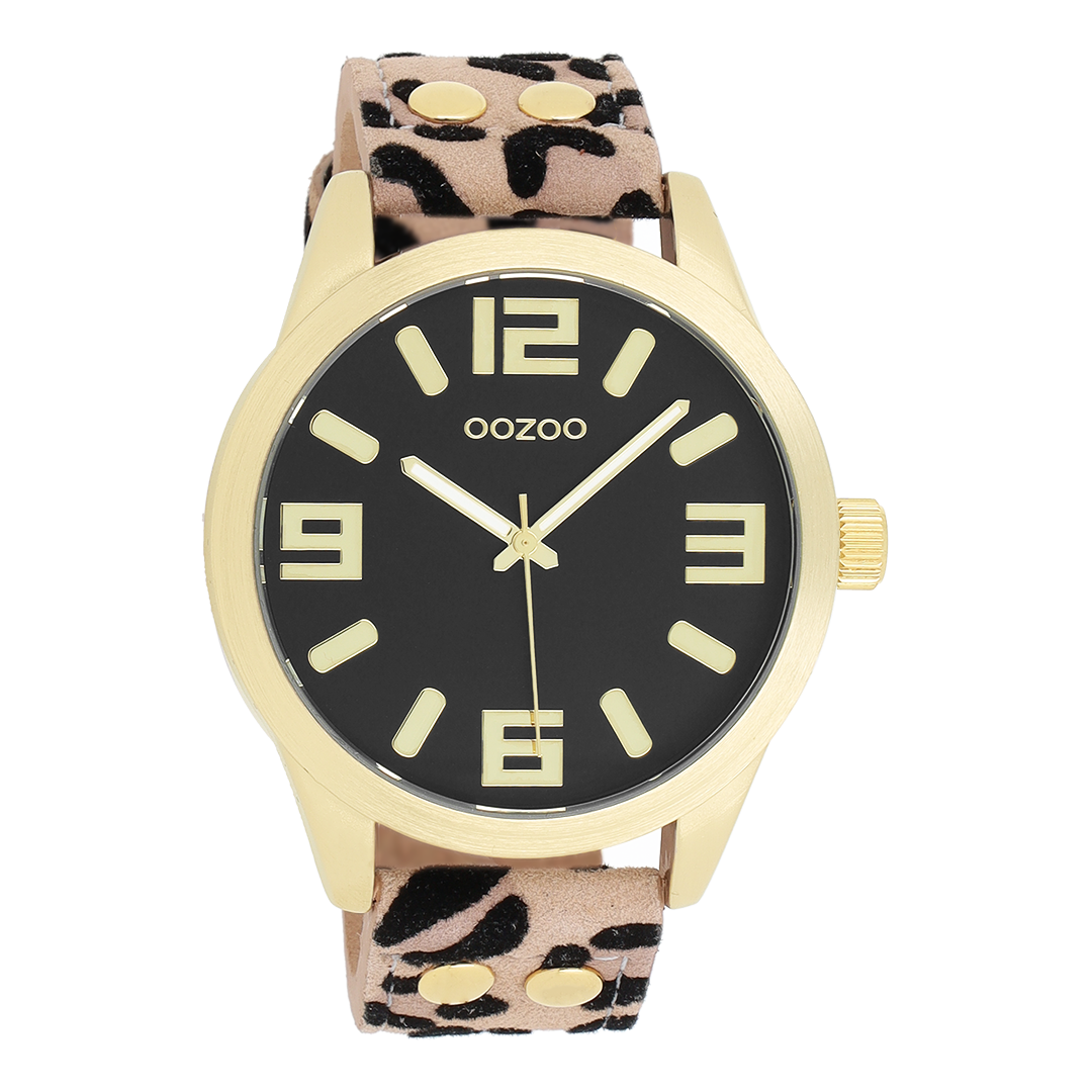 Καινούριο, διαφορετικό και μοδάτο! Το εντελώς νέο ρολόι από την OOZOO έχει υπέροχο leopard print δερμάτινο λουράκι και μαύρο καντράν. Η γνωστή κάσα OOZOO είναι σε χρυσό χρώμα με χρυσούς δείκτες & στοιχεία.