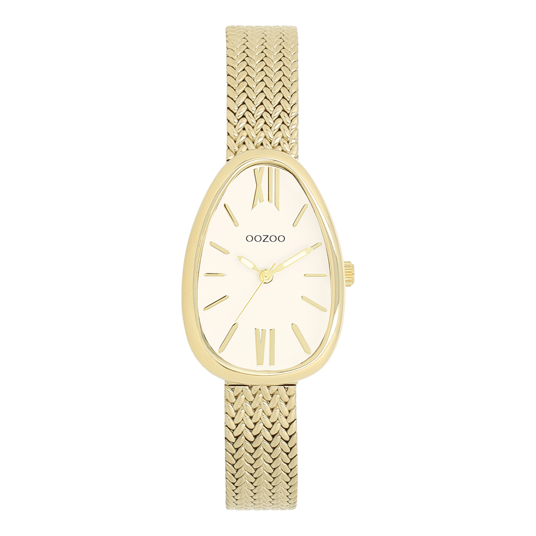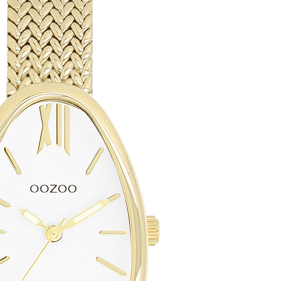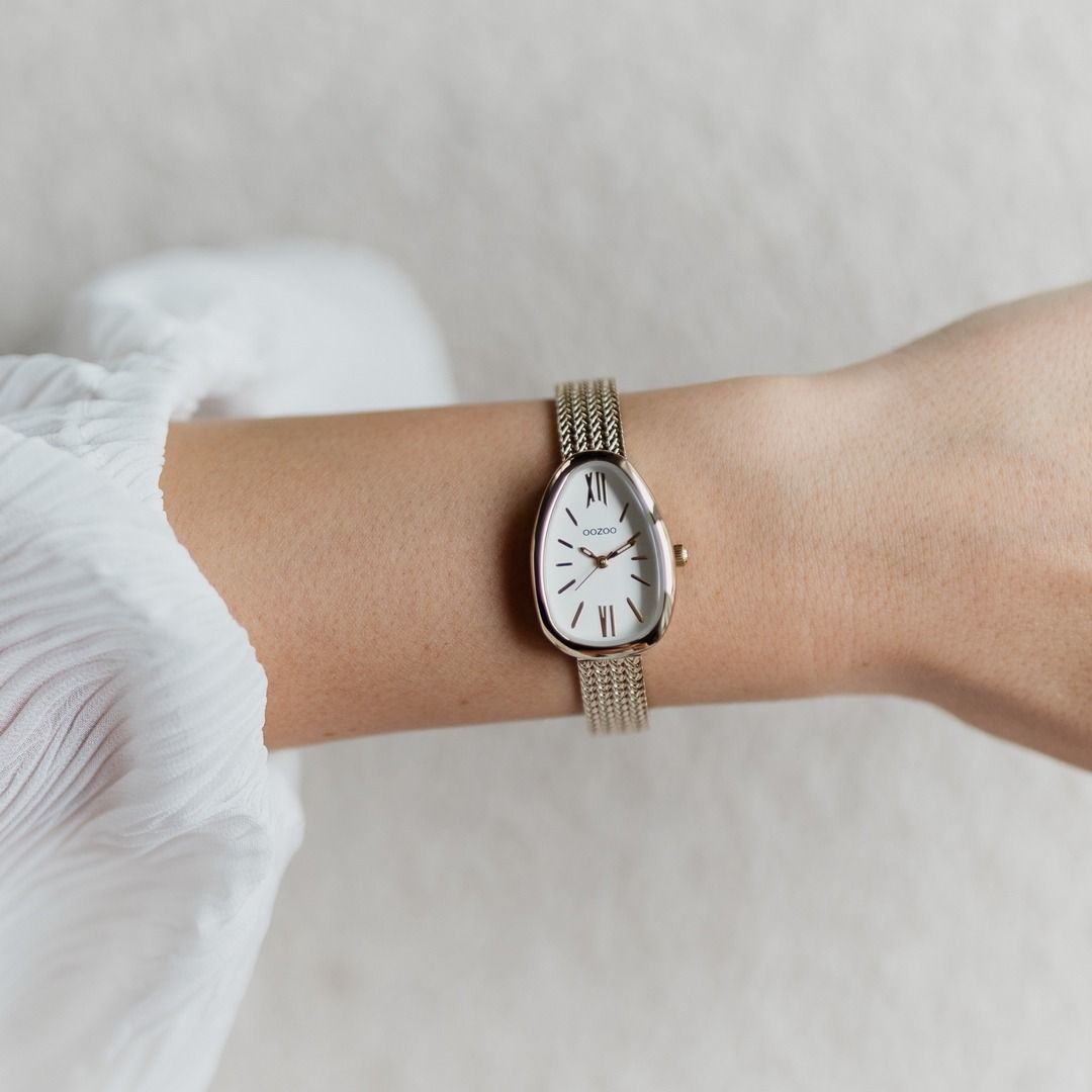 Something completely different. The egg-shaped OOZOO watch offers an unusual but familiar shape on the wrist. The gold case is combined with a brand new V-mesh stainless steel bracelet and a set of stripes & roman numerals on the dial give it a classy, timeless feel.