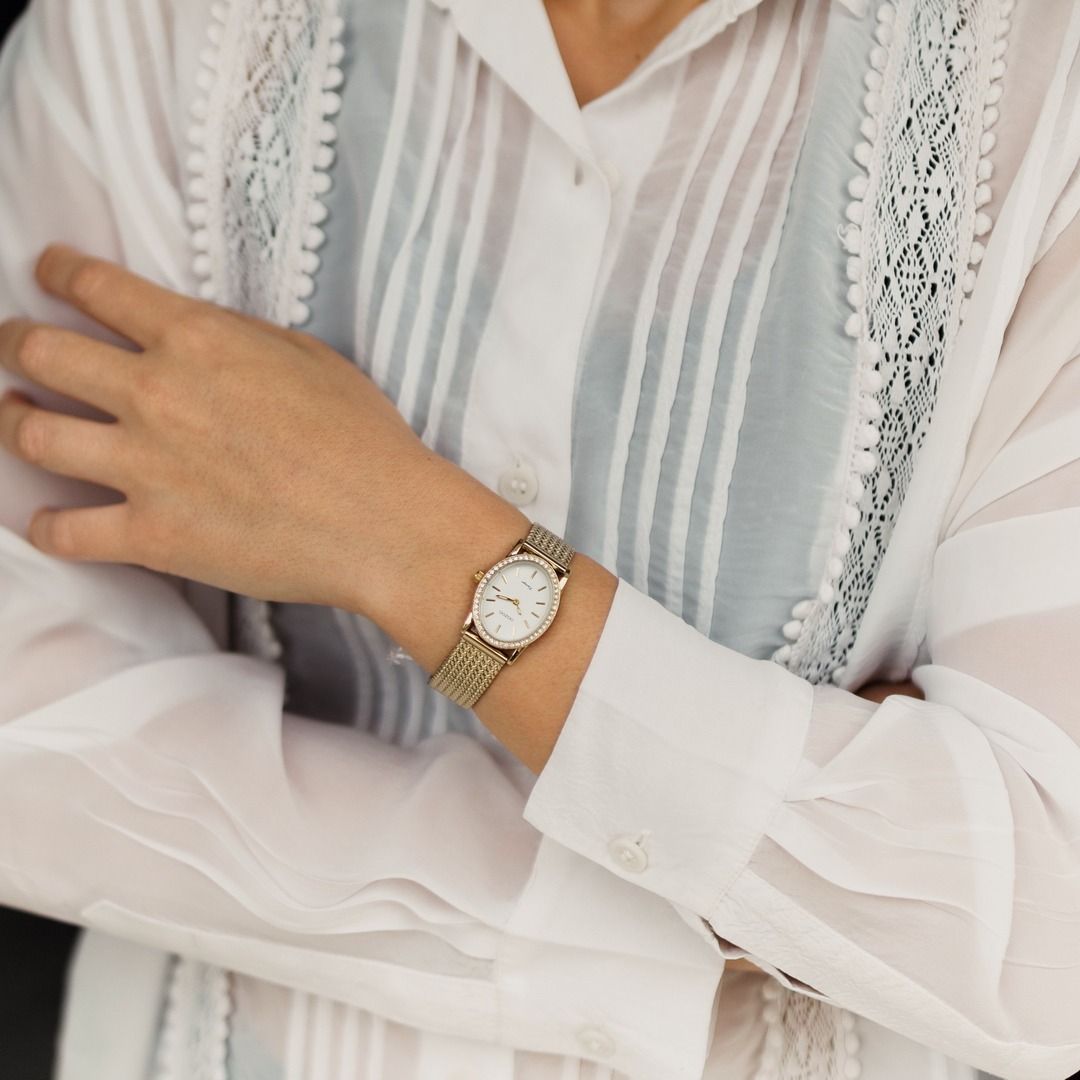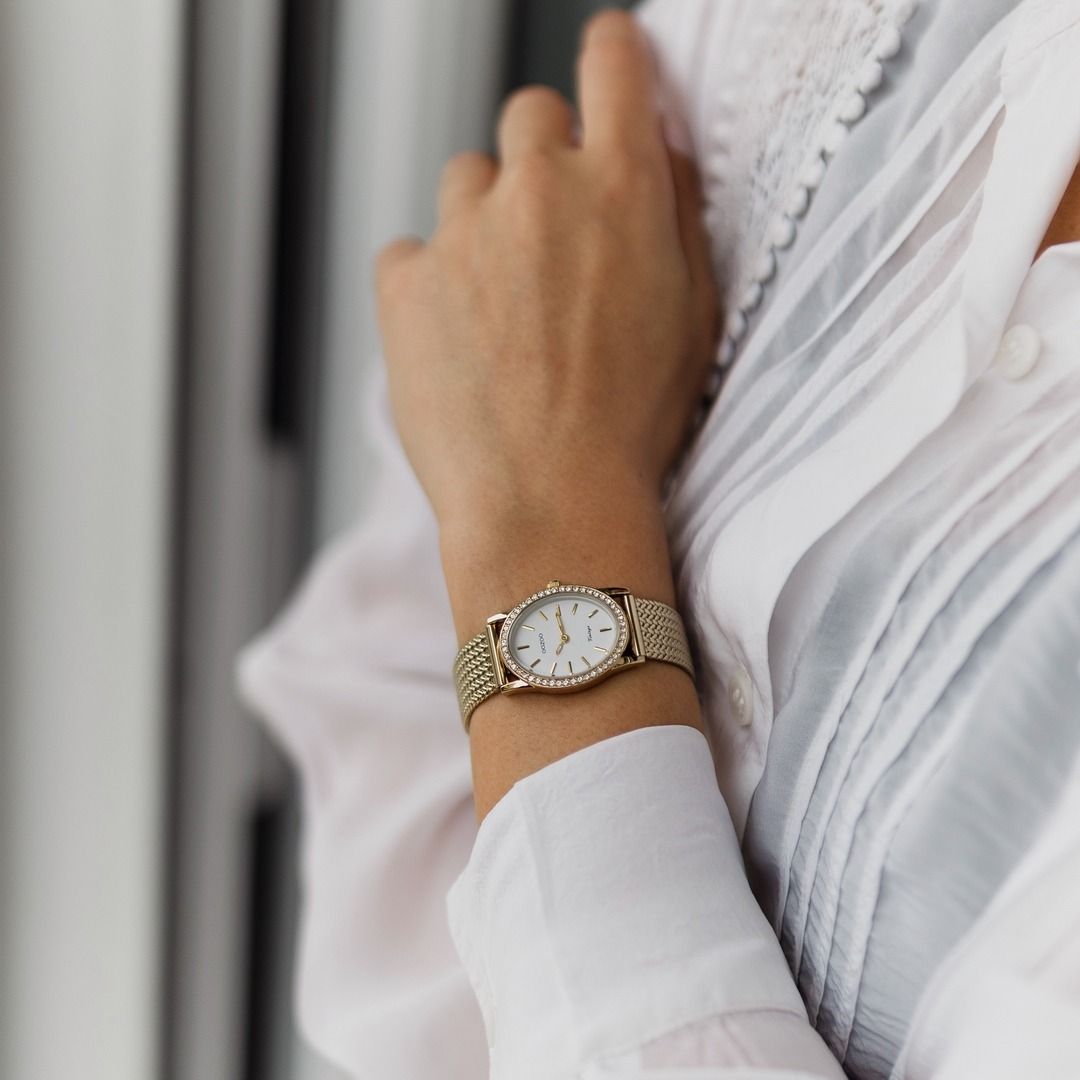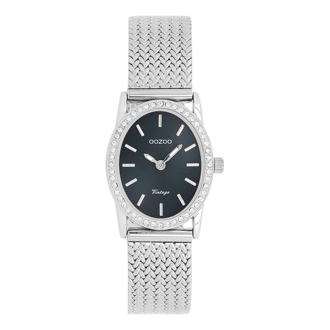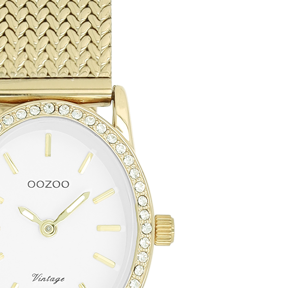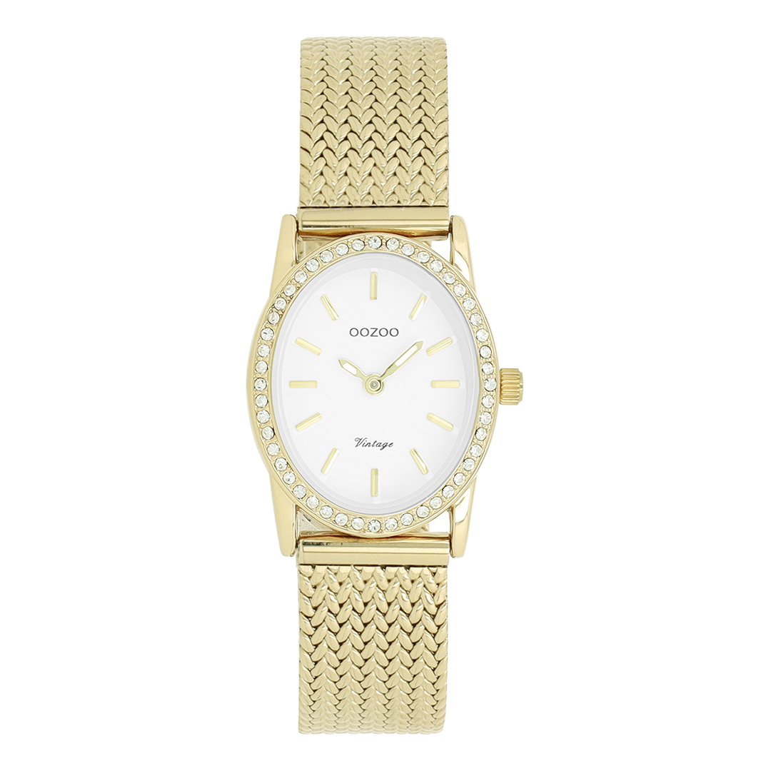 The distinct oval OOZOO Vintage watch is decorated with crystals giving it that extra shine. The 28mm oval case is colored gold and has a matching metal V-mesh bracelet and a white dial.