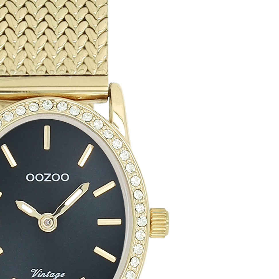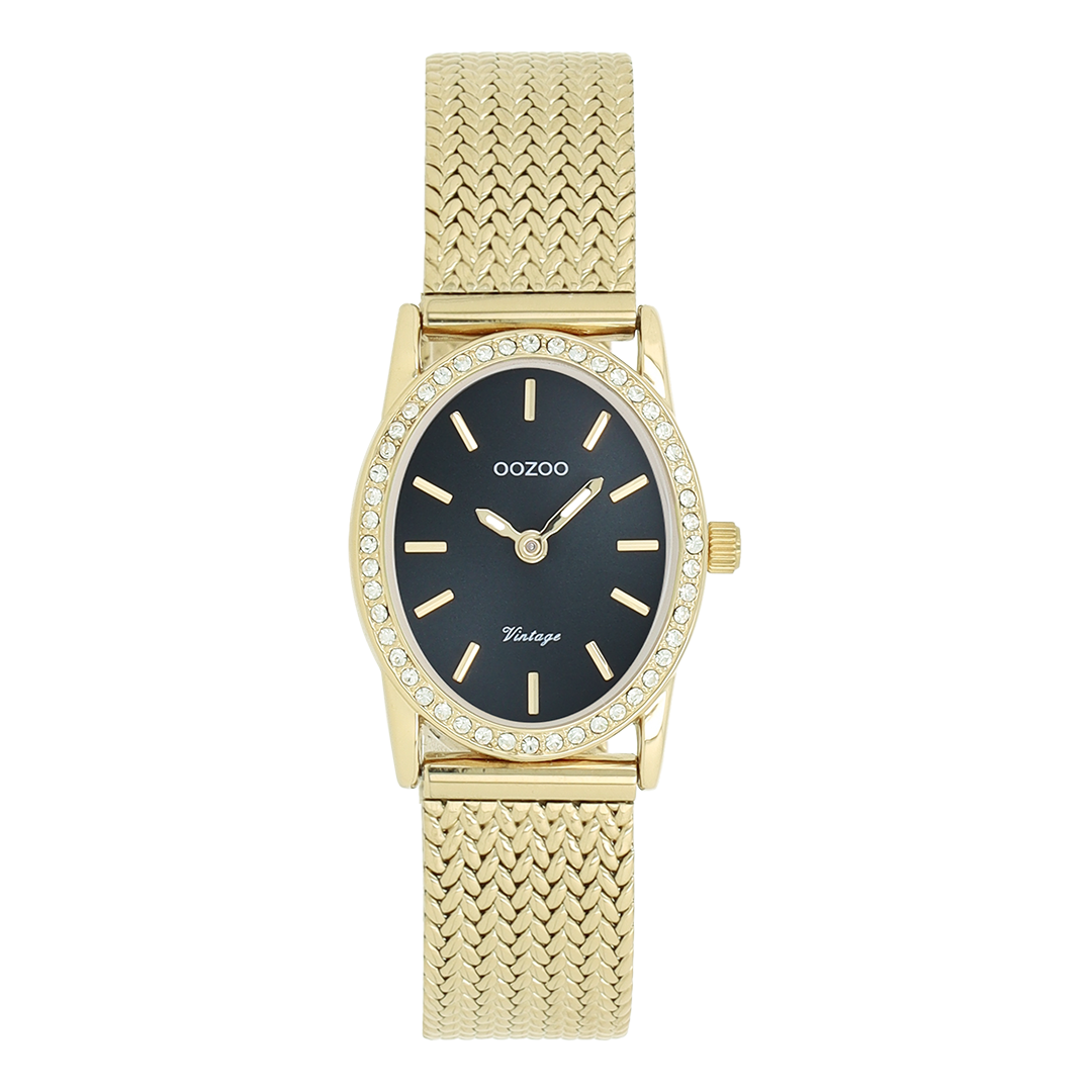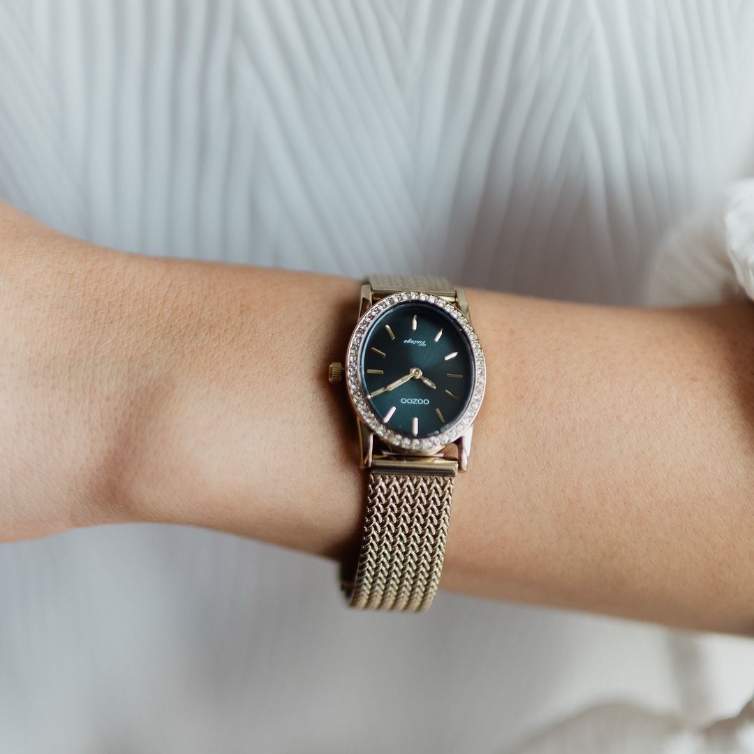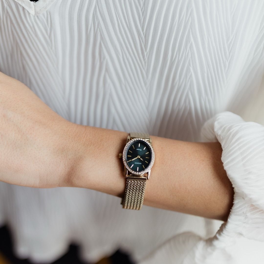 The distinct oval OOZOO Vintage watch is decorated with crystals giving it that extra shine. The 28mm oval case is colored gold and has a matching metal V-mesh bracelet and a forest green dial.